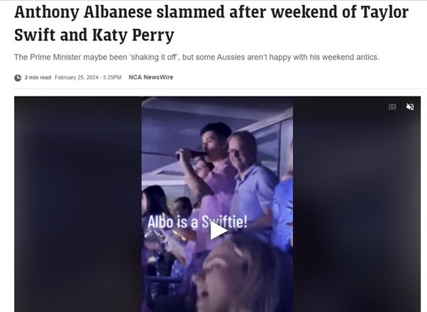 We are in the midst of Taylor Swift mania, during her current tour of Australia. Prime Minister “Albo” got his free tickets and has been shown dancing in the crowd. This seems to have upset some people.