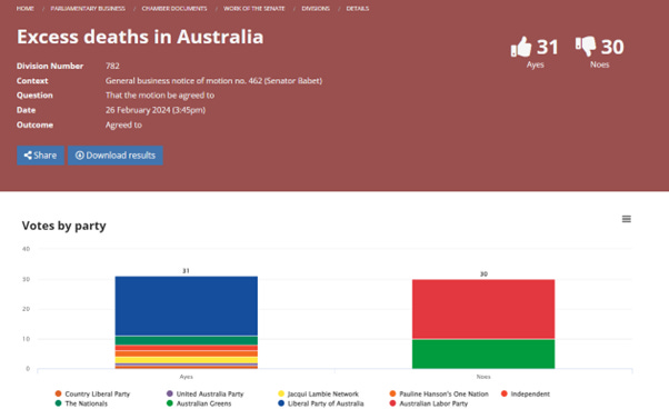Michael Arbon, Advisor to Senator Ralph Babet, reported yesterday that the Australian Senate voted in favour of Senator Babet’s general business motion around excess deaths in Australia. 31 Senators supported the motion and 30 voted against.